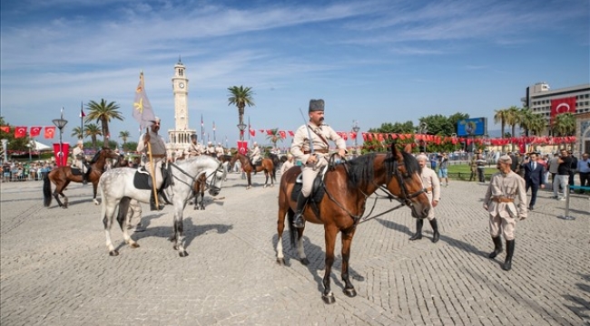 İzmir’in işgalden kurtuluşunun 101. yıldönümü kutlamaları kapsamında Konak Atatürk Meydanı’nda temsili bayrak töreni yapıldı. Törende İzmir’in kurtuluşunu canlandıran süvari birlikleri Hükümet Konağı’nın önüne geldi ve Yüzbaşı Şerafettin’i temsil eden bir asker göndere Türk bayrağı çekti.