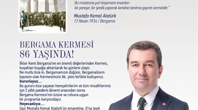 Türkiye’nin ilk yerel festivali olma özelliği taşıyan, Gazi Mustafa Kemal Atatürk’ün öngörüsü ile 1937 yılından beri 86 yıldır kesintisiz olarak düzenlenen Uluslararası Bergama Kermesi 20-26 Haziran tarihlerinde zengin içeriği ile başlıyor.