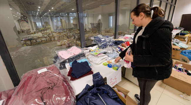 Gaziemir Fuar İzmir, Kültürpark Celal Atik Spor Salonu ile Çankaya'daki APİKAM'ın bahçesinde yurttaşlardan gelen insani yardım malzemelerinin paketlenme ve yükleme çalışmaları sürüyor.