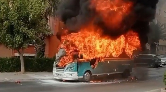 İzmir'in Gaziemir ilçesinde seyir halindeyken dumanların çıktığı minibüs kısa sürede alev topuna döndü. Yangında ölen ya da yaralanan olmazken, yanan minibüs kullanılamaz hale geldi.