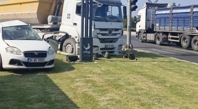 Kaza sabah saatlerinde Hürriyet Caddesi ile Şükran Kurdakul Caddesi kesimindeki ışıklı kavşakta meydana geldi. Edinilen bilgilere göre; İzmir yönünden gelen G.Z idaresindeki 35 HA 8663 plakalı hafriyat kamyonu ile Şükran Kurdakul Caddesi'nden gelen İsmail Ç. yönetimindeki 34 NU 9055 plakalı otomobil çarpıştı. Her iki araç da çarpışmanın etkisiyle orta refüje savruldu. Kazada otomobil sürücüsü İsmail Ç. ile hafriyat sürücüsü G.Z yaralandı.