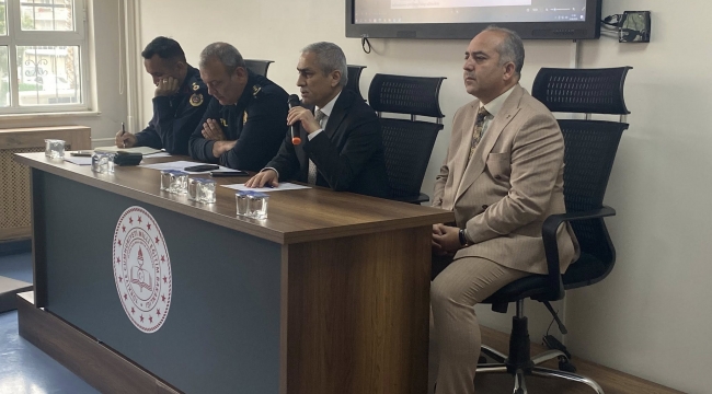 Aliağa ilçesinde eğitim kurumlarının güvenliğine yönelik alınacak tedbirlerin değerlendirilmesi amacıyla toplantı düzenlendi.