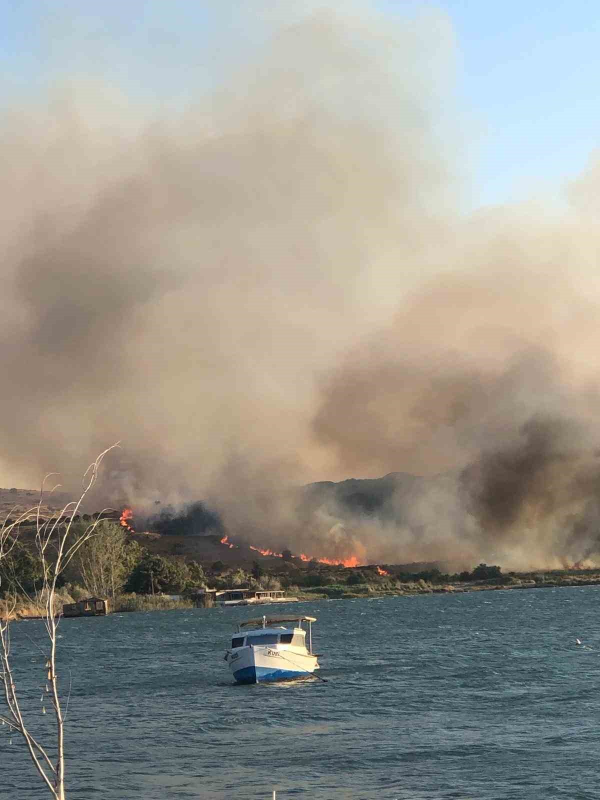 İzmir’in Aliağa ilçesinde otluk alanda çıkan yangın, rüzgarın etkisiyle hızla büyüdü.