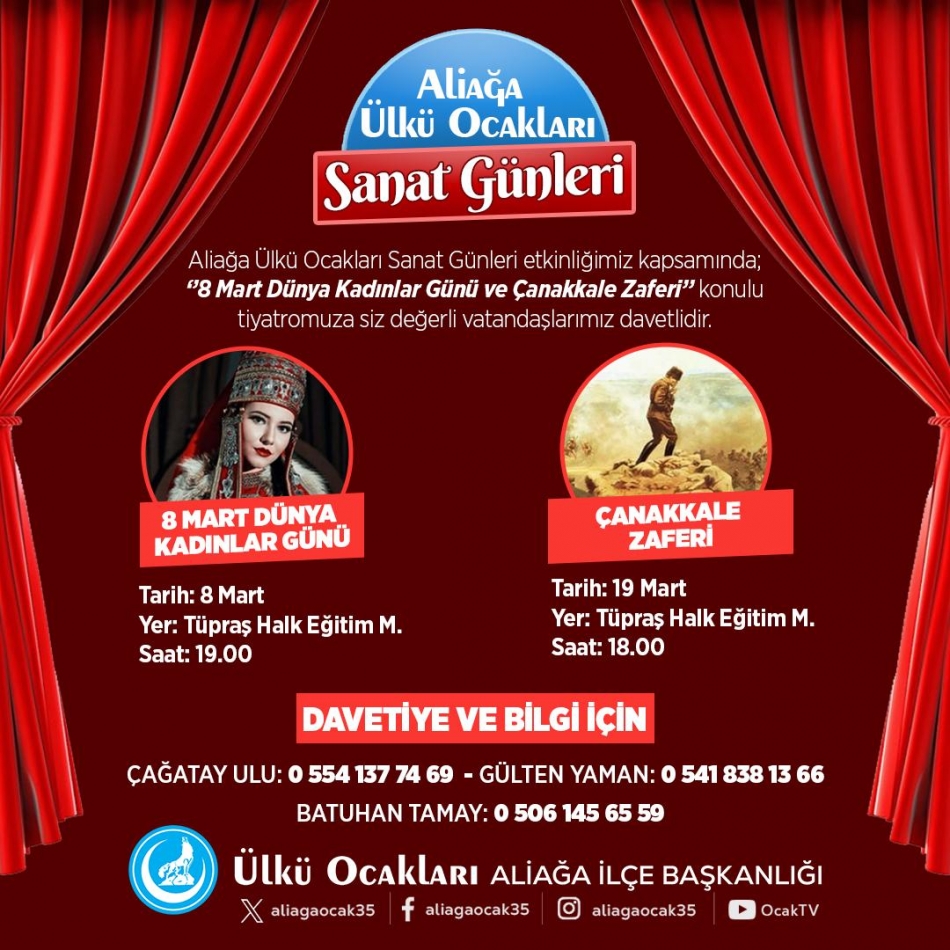 Aliağa Ülkü Ocakları Başkanı Çağatay Ulu yaptığı açıklamada, "Mart ayına özel olarak hazırladığımız iki tiyatro oyunu ile hem Dünya Kadınlar Günü'nü kutlamak hem de Çanakkale Zaferi'nin önemini vurgulamak istiyoruz. Tüm vatandaşlarımızı bu anlamlı etkinliklere davet ediyoruz." dedi.