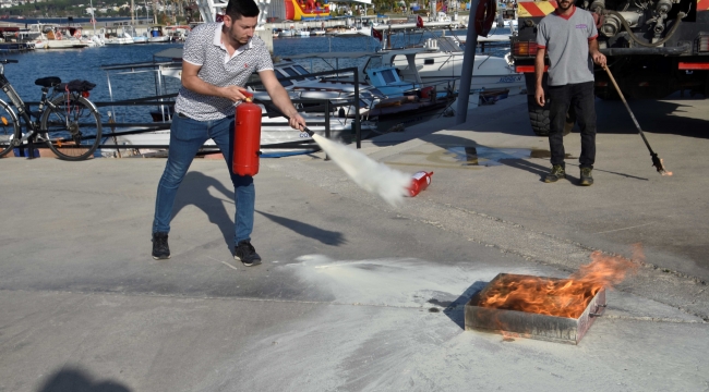 Aliağa Amatör Balıkçılar ve Deniz Sporları Derneği’nde (ALDER) düzenlenen eğitimde yangın anındaki paniğin nasıl kontrol edilebileceğini, acil durum anında nasıl önlemler alınması gerektiği, mevcut acil duruma müdahale edilmesi gerektiğinde neler yapılmalı gibi konular uygulamalı olarak balıkçılara anlatıldı.
