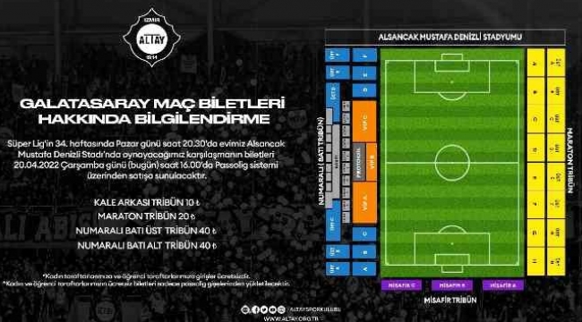 Spor Toto Süper Lig'in 34. haftasında Altay'ın Galatasaray'ı konuk edeceği maçın biletleri satışa çıktı. Mücadelenin biletleri 10, 20 ve 40 TL olarak açıklandı.