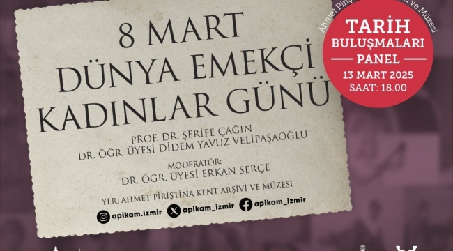 İzmir Büyükşehir Belediyesi Kent Arşivi ve Müzeler Şube Müdürlüğü ve Tarih Vakfı iş birliğinde “Tarih Buluşmaları” adıyla yapılan söyleşi ve panel dizisi, 8 Mart Dünya Emekçi Kadınlar Günü paneline sahne olacak. 13 Mart Perşembe günü saat 18.00’de APİKAM’da başlayacak panel, kadın emeğinin ekonomik, kültürel, sanatsal, düşünsel anlamda toplumsal gelişime sunduğu katkıya, kadınların bu alandaki sorunlarına ve çözüm önerilerine odaklanacak. Panel, Dokuz Eylül Üniversitesi Buca Eğitim Fakültesi Türkçe ve Sosyal Bilimler Eğitimi Bölümü’nden Dr. Öğretim Üyesi Erkan Serçe moderatörlüğünde yapılacak. Panelin konuklarından Ege Üniversitesi Edebiyat Fakültesi Türk Dili ve Edebiyatı Bölümü’nden Prof. Dr. Şerife Çağın, “İzmir'in Öncü Kadın Yazarlarından Vedide Baha Pars” başlıklı bir konuşma yapacak. İzmir Ekonomi Üniversitesi Güzel Sanatlar ve Tasarım Fakültesi İç Mimarlık ve Çevre Tasarımı Bölümü Öğretim Üyesi Dr. Didem Yavuz Velipaşaoğlu ise “Hereke Fabrikası’nda Emek Dokusu” konu başlığıyla bir sunum yapacak.
