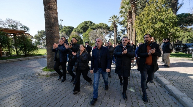 DİSK Ege Bölge Temsilcisi Memiş Sarı ise “Biz aslında bir yolun aynı yolcusuyuz. Bu kenti hep birlikte büyütmek bu kentin insanlarına hep birlikte hizmet etmek için çalışıyoruz. Dönem dönem ufak tefek sorunlar yaşayabiliriz ama tüm ülke ve İzmir bilsin ki biz İzmir Büyükşehir Belediyesi çalışanları İzmir Büyükşehir Belediye Başkanı Cemil Tugay ile aynı yolu yürüyoruz. Bu yanlış anlaşılmayı ortadan gidermek adına bugün arkadaşlarımızla Başkan’ımıza çiçek vermek ve ona teşekkür etmek için buradayız. Bilsinler ki bundan sonra da aynı yolda bu kente hizmet etmek için yan yana yürüyeceğiz. Sağda solda parçalanmış görüntü vermek isteyenlere hep birlikte ‘kurtuluş yok tek başına ya hep beraber ya hiçbirimiz’ diyoruz” ifadelerini kullandı.
