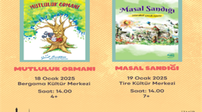 18 Ocak günü Bergama Kültür Merkezi’nde 4 yaş üzeri çocuklar için Mutluluk Ormanı, 19 Ocak günü Tire Kültür Merkezi’nde 7 yaş üzeri çocuklar için Masal Sandığı, 20 Ocak günü Kemalpaşa Belediyesi Mesire Alanı Atatürk Düğün Salonu’nda ve 21 Ocak günü Bornova Belediyesi Altındağ AKM Yıldız Kenter Sahnesi’nde 4-10 yaş arası çocuklar için Masal Karnavalı, 22 Ocak günü Kiraz Belediyesi Düğün Salonu’nda ve 23 Ocak günü Beydağ Kültür Merkezi’nde 4-9 yaş arası çocuklar için Mucit Palyaço, 25 Ocak günü Kınık Mustafa Kemal İlkokulu’nda 3 yaş üzeri çocuklar için Dört Mevsim Bir Kuş, 26 Ocak günü Foça Belediyesi Reha Midilli Kültür Merkezi’nde 7 yaş üzeri çocuklar için Masal Sandığı, 28 Ocak günü Çiğli Belediyesi Fakir Baykurt Konferans Salonu’nda 4 yaş üzeri çocuklar için Küçük Kahramanlar, 29 Ocak günü Aliağa Kültür Merkezi’nde 5 yaş üzeri çocuklar için Meselhan ve Gamze Bi Dünya Masal, 30 Ocak günü Gaziemir Belediyesi Atatürk Kültür Merkezi’nde 5 yaş üzeri çocuklar için Meselhan ve Gamze Bi Dünya Masal, 2 Şubat günü Ödemiş Kültür Merkezi’nde 3 yaş üzeri çocuklar için Dört Mevsim Bir Kuş tiyatro oyunları ücretsiz olarak sahnelenecek. Tüm oyunlar saat 14.00’te başlayacak.