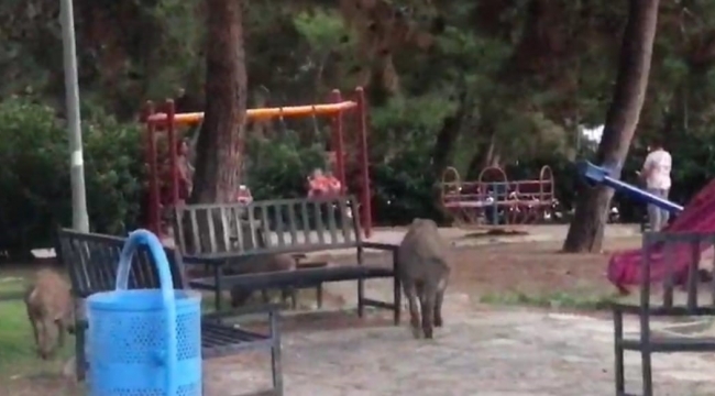 İzmir’in Bornova ilçesinde, çocukların oyun oynadığı esnada parka gelerek yiyecek arayan domuz sürüsü cep telefonu kamerasına yansıdı.