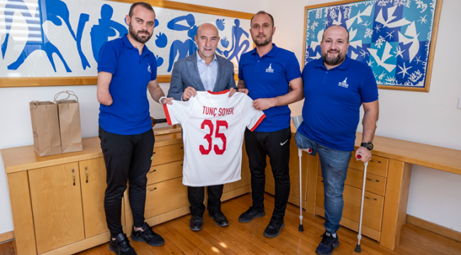 Dünya Kupası’nı kazanan Ampute Futbol Milli Takımı’nın ve İzmir Büyükşehir Belediyesi Gençlik ve Spor Kulübü’nün kalecisi Erdi Arslan Başkan Tunç Soyer’i ziyaret ederek yaşadığı mutluluğu paylaştı. Arslan, Başkan Soyer’e Ay-Yıldızlı formayı hediye ederken Başkan Soyer ise, “Hiç görmediğiniz çocuklara umut oluyorsunuz” dedi.