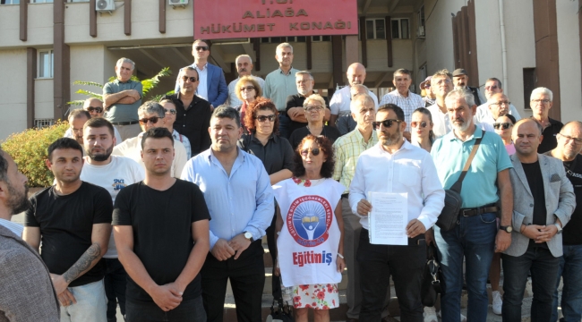 Eğitim-İş İzmir 7 nolu Şubesi de suç duyurusunda bulunmak üzere Aliağa Adliyesi önünde basın açıklaması gerçekleştirdi.