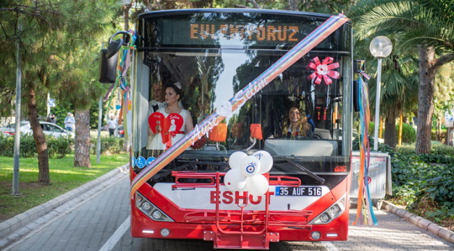 İzmir Büyükşehir Belediyesi ESHOT Genel Müdürlüğü bünyesinde otobüs şoförlüğü yapan Ayşe Akyol ve Selim Akpınar bir ömür mutluluğa “Evet” dedi. Çiftin gelin arabası da bir otobüs oldu.
