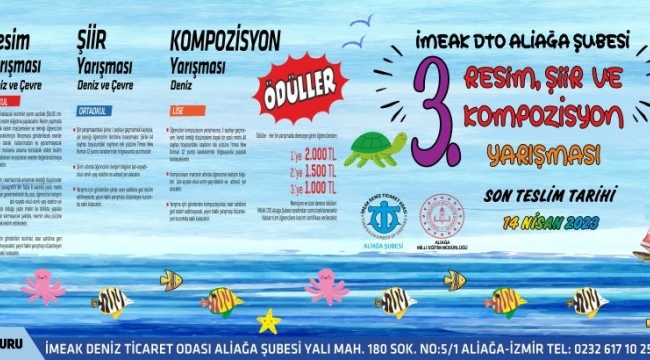 İMEAK Deniz Ticaret Odası Aliağa Şubesi’nin 2019 yılında öğrencilerde deniz sevgisi ve bilinci oluşturmak amacıyla Aliağa İlçe Milli Eğitim Müdürlüğü ile birlikte başlattığı resim, şiir ve kompozisyon yarışmasının bu yıl üçüncüsü düzenleniyor. Düzenlenen yarışmada dereceye giren öğrencilere çeşitli ödüllerin yanı sıra tüm katılımcılara sertifika verilecek.