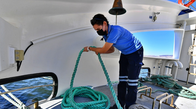 Dümen tutuyor, halat bağlıyor, araç yerleştiriyor. “Tabuları yıkmak gerek. Erkeğin yaptığı her işi kadın da yapar” diyerek İZDENİZ’in ilk kadın güverte personeli olarak iş başı yapan Tuğba Çokoğullu’nun hayali kaptan olmak.