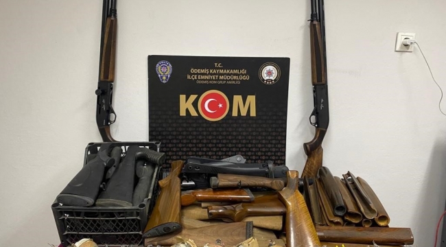 İzmir Organize Suçlarla Mücadele Şube Müdürlüğü ve Ödemiş KOM Grup Amirliği ekipleri, ilçede 3 şüpheliye ait iş yerinde silah imalatı ve ticareti yapıldığı bilgisi üzerine harekete geçti. Ödemiş Cumhuriyet Başsavcılığı koordinesinde adrese gerçekleştirilen baskında 3 şüpheli yakalanarak gözaltına alındı. Yapılan aramada, 32 adet el yapımı patlayıcı piroteknik madde, 60 tabanca fişeği, 743 adet çeşitli tabanca parçası( icra yayı, kabze, icra milli, namlu vs), 2 ruhsatsız tüfek, 3 bin 607 adet havai fişek ile çok sayıda namlu ucu açmaya yarayan teknik malzeme ele geçirildi.