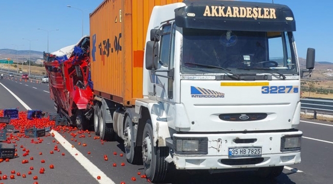 Kaza, saat 15.30 sıralarında Kuzey Ege Otoyolu Aliağa mevkiinde meydana geldi. Edinilen bilgiye göre, Çandarlı istikametinden İzmir istikametine giden Murat Zencir (22) idaresindeki 35 DAA 57 plakalı sebze yüklü kamyon, aynı yönde seyir halinde olan H.A.Ç. (61) idaresindeki 35 HB 7825 plakalı konteyner yüklü tıra arkadan çarptı. Kamyon tıra ok gibi saplanırken, kasadaki domatesler yola savruldu. Kazayı görenlerin ihbarı üzerine bölgeye polis, itfaiye ve sağlık ekipleri sevk edildi.