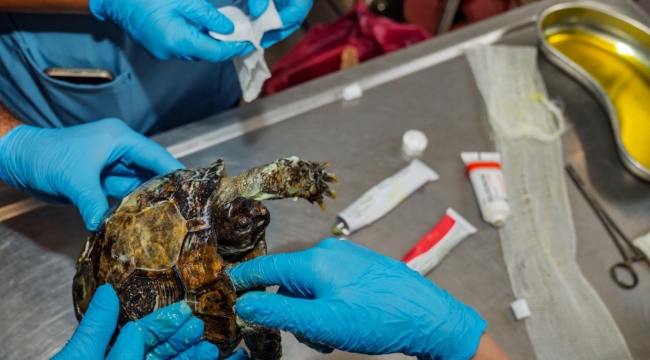 Tedavisi süren kaplumbağa, İzmir Doğal Yaşam Parkı’na sevk edildi. Tedaviye yanıt vermesi ve tam anlamıyla iyileşmesi halinde yaşam alanına geri dönecek.