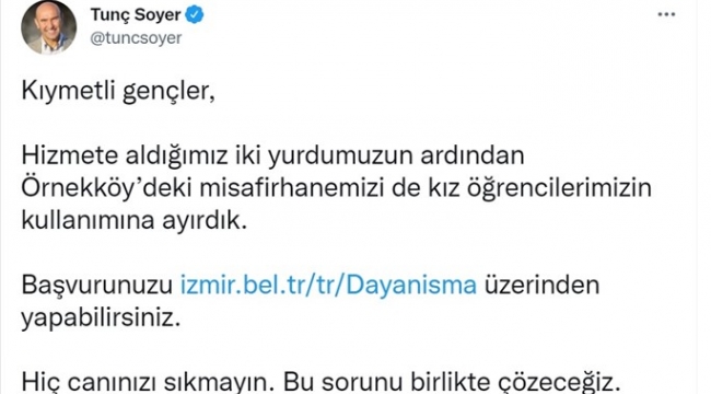 Üniversiteli gençlerin barınma sorununun çözümü için harekete geçen İzmir Büyükşehir Belediyesi, belediyenin web sitesi üzerinden başvuruları almaya başladı. Sosyal medyadan gençlere seslenen İzmir Büyükşehir Belediye Başkanı Tunç Soyer, “Kıymetli gençler, hizmete aldığımız iki yurdumuzun ardından Örnekköy’deki misafirhanemizi de kız öğrencilerimizin kullanımına ayırdık. Hiç canınızı sıkmayın. Bu sorunu birlikte çözeceğiz” dedi.