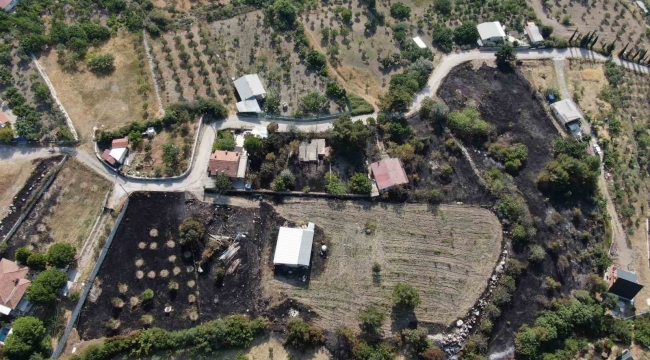 Beşyol Mahallesi’nde 3, Sarnıç Mahallesi’nde ise 4 evin hasar aldığı orman yangınının oluşturduğu hasar havadan görüntülendi. Görüntülerde, ormanlık alanın bir kısmının tamamen siyah külle kaplandığı yer alıyor.
