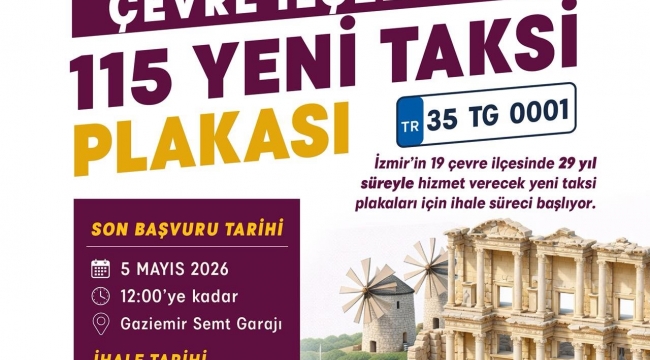 İzmir Büyükşehir Belediyesi, 19 çevre ilçede 29 yıllığına faaliyet gösterecek 115 taksi plakası için 7 Mayıs’ta ihaleye çıkıyor.