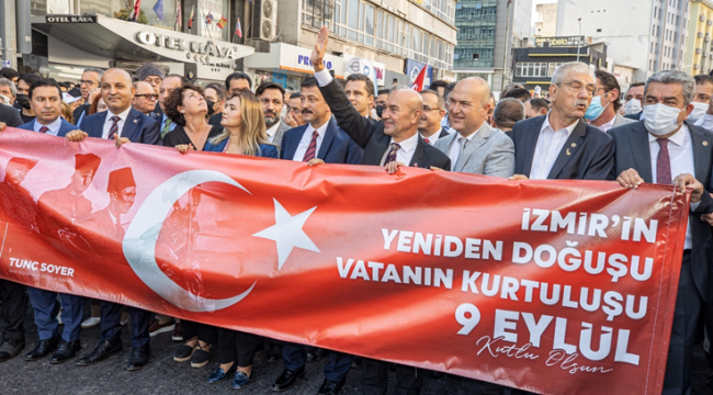 İzmir Büyükşehir Belediyesi'nin hazırladığı 350 metre uzunluğundaki Türk bayrağını taşıyan İzmirliler; Türk ordusunun kente girdiği tarihi güzergahı izleyerek Gaziler, Anafartalar ve İkiçeşmelik caddeleri üzerinden Cumhuriyet Meydanı'na ulaştı. Marşlar eşliğinde ilerleyen korteje çevredeki vatandaşlar da alkışlarla destek verdi. İzmir Büyükşehir Belediye Başkanı Tunç Soyer, 9 Eylül'ün önemine değinerek, "Bir memleketin esaretinin son bulduğu gün bugün. Ve Türkiye Cumhuriyeti'nin kuruluşu ve kurtuluşu arasındaki köprüdür. O nedenle İzmir sadece İzmir değil. 9 Eylül sadece İzmir'in kurtuluşu değil. 9 Eylül bir memleketin esaretten kurtuluşudur. O nedenle en büyük bayramdır. Çok gururluyuz" dedi.