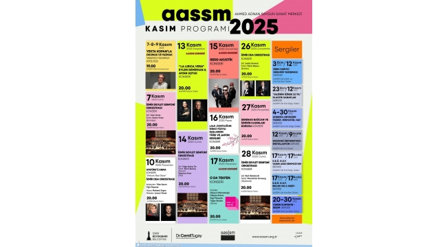 Ahmed Adnan Saygun Sanat Merkezi (AASSM), kasım ayında dopdolu bir sanat programıyla İzmirlileri müziğin, edebiyatın ve görsel sanatların büyülü atmosferine davet ediyor. Her biri özenle seçilmiş konserler, atölyeler ve sergilerle dolu bu ayda sanatseverleri unutulmaz bir kültür yolculuğu bekliyor.