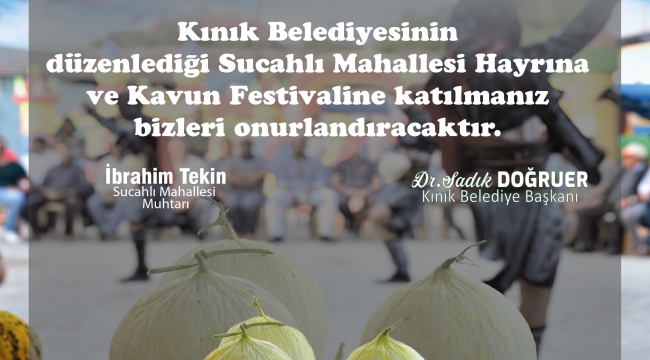 Kınık Belediyesi'nin ev sahipliğinde yapılacak olan Kınık Belediyesi Sucahlı Kavun Festivali'ne tüm halkımız ,Derneklerimiz, Stk Üyeleri ve  Basın Mensupları davetlidir.