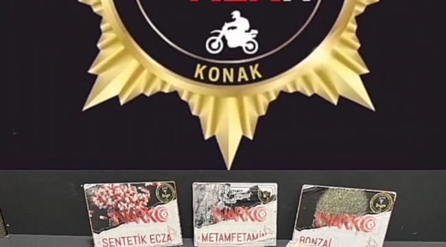 Konak İlçe Emniyet Müdürlüğü ve Narkotik Suçlarla Mücadele Şube Müdürlüğü personelince oluşturulan Narko Alan ekipleri tarafından 16-23 eylül tarihleri arasında uyuşturucu madde bulundurulduğu ve satışının yapıldığı değerlendirilen ikamet ve işyerlerine operasyon yapıldı. 10 ayrı adrese yapılan baskınlarda bin 721 adet uyuşturucu hap, 565,18 gram ’Bonzai’ diye tabir edilen uyuşturucu madde, 33,17 gram ’metamfetamin’ olarak bilinen uyuşturucu madde, 122 gram ve 255 adet ’extacy’ olarak bilinen uyuşturucu madde, 3 adet hassas terazi, 2 adet ruhsatsız tabanca, uyuşturucu ticaretinden elde edilen 17 bin 500 TL ele geçirildi.