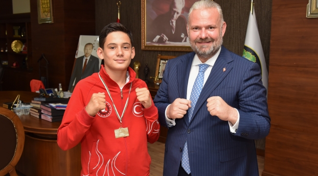 Bulgaristan’da yapılan Avrupa Şampiyonası’nda Wushu Kung Fu dalında altın madalyanın sahibi olan Adar Kalay, Menemen Belediye Başkan Vekili Aydın Pehlivan’a söz verdi. 13 yaşındaki Kalay, Aralık ayında Malezya’da yapılacak şampiyonadan Dünya Şampiyonu olarak döneceğini söyledi. Kalay’ı tebrik eden Pehlivan, “Kentimize ve Ülkemize Avrupa şampiyonu olarak dönmekle bizleri gururlandırdın. Ne mutlu bize. Çok çalışarak Dünya Şampiyonu da olacağından hiç şüphem yok. Menemen Belediyesi olarak her zaman yanındayız” dedi.