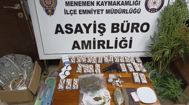 Edinilen bilgiye göre Menemen İlçe Emniyet Müdürlüğü Asayiş Büro Amirliğine bağlı ekipler uyuşturucuyla mücadele çalışmaları kapsamında saha ve istihbari çalışmalar sonucunda 9 Eylül mahallesi 8.caddede bir ikamette operasyon düzenlendi. Savcılık talimatıyla adrese gerçekleştirilen operasyonda, bin 435 adet yeşil reçeteye tabi sentetik ecza, 360 gram esrar, 86 gram esrar tohumu, saksı içerisinde 12 esrar bitkisi, bitkileri yetiştirmek için kullanılan ısı ve ışık sistemi ile 1 hassas terazi, 1 ruhsatsız tabanca, tabancaya ait şarjör ve 13 fişek ele geçirildi.