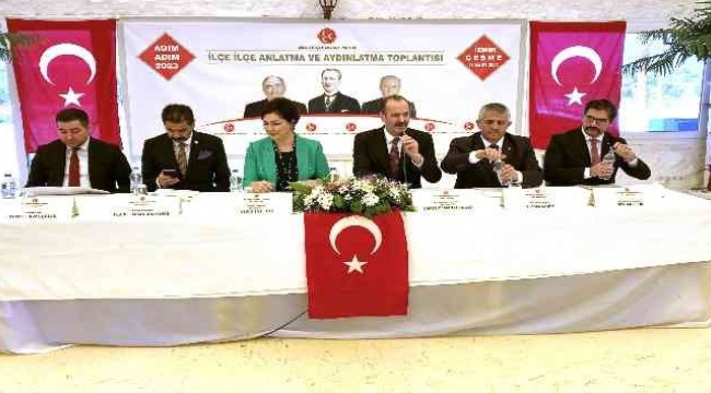 Milliyetçi Hareket Partisi (MHP) Genel Başkanı Devlet Bahçeli'nin talimatıyla tüm Türkiye'de başlatılan “Adım adım 2023, ilçe ilçe anlatma ve aydınlatma toplantıları” İzmir'de tüm hızıyla devam ederken, MHP İzmir Milletvekili Tamer Osmanağaoğlu'nun Çeşme'de başkanlık ettiği toplantıya, İzmir Milletvekili Hasan Kalyoncu, Ankara Milletvekili Nevin Taşlıçay ve MHP Merkez Yönetim Kurulu Üyesi Ahmet Savaş Çolak konuşmacı olarak yer aldı.