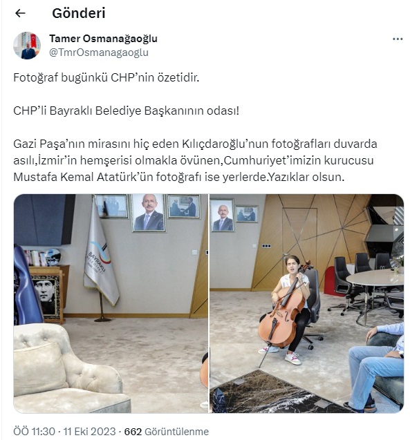 Açıklamasında “Fotoğraf bugünkü CHP’nin özetidir. CHP’li Bayraklı Belediye Başkanının odası!” ifadelerine yer veren Osmanağaoğlu “Gazi Paşa’nın mirasını hiç eden Kılıçdaroğlu’nun fotoğrafları duvarda asılı, İzmir’in hemşerisi olmakla övünen Cumhuriyet’imizin kurucusu Mustafa Kemal Atatürk’ün fotoğrafı ise yerlerde. Yazıklar olsun!” dedi.