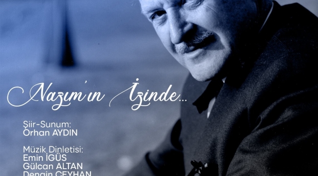 İzmir Büyükşehir Belediyesi şair ve yazar Nazım Hikmet’i 120’inci yaş günü olan 15 Ocak’ta “Nazım’ın İzinde…” adlı etkinlikle anıyor. Cumartesi günü saat 20.00'de Ahmed Adnan Saygun Sanat Merkezi'nde (AASSM) ücretsiz yapılacak etkinlikte tiyatro sanatçısı Orhan Aydın’ın sunumu ve şiir dinletisi olacak. Emin İgüs, Gülcan Altan ve Dengin Ceyhan ise müzik dinletisiyle sahnede olacak. Etkinliğin sahne amirliğini Muhlis Asan, ışık tasarımını ise Yüksel Aymaz üstleniyor.