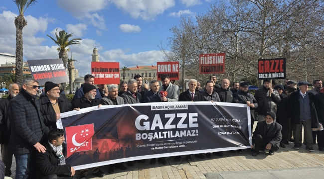Bu kapsamda ellerinde Filistin bayrakları ve Filistin'e destek mesajları içeren dövizler taşıyarak Konak Meydanı’nda toplanan Saadet Partisi İzmir Teşkilatı adına konuşan İl Başkanı Zekeriya Hazırbulan, Siyonist İsrail tarafından Gazze’de uygulanan soykırımın 467 gün sürdüğünü ve katil İsrail’in kadın, çocuk, yaşlı demeden 50 binin üzerinde Gazzeli mazlumu katlettiğini hatırlattı. Gazze’de binalar yıkıldıkça insanlığın temel değerlerinin de yıkıldığına ve Gazzeli mazlumlarla beraber vicdanın da öldüğüne dikkat çeken Hazırbulan, “Atılan her bombada Batı’nın demokrasi, insan hakları, hukuk kavramları da yerle yeksan oldu. Hastanelere sığınanlara ölüm yağdırıldı. Yüz binlerce mazlum açlık, susuzluk ve soğukla sınandı. Bütün bunlar olup biterken Türkiye başta olmak üzere bölge ülkeleri ve dünya ülkelerinin çoğu ya sessizliği ya da suya sabuna dokunmayan kınamaları tercih etti. Devekuşu Paradoksu ile çözüm bulunacağı zannedilmiş, soykırım görmezden gelinmiştir.” dedi.
