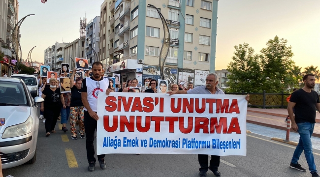 2 Temmuz 1993 tarihinde Sivas’taki Madımak Oteli’nde yaşanan olaylarda çıkan yangın sonucu hayatını kaybeden, aralarında yazar ve sanatçıların bulunduğu 33 kişi için İzmir’in Aliağa ilçesinde anma programı yapıldı. Program, Emek ve Demokrasi Platformu Bileşenleri öncülüğünde gerçekleşti. Alevi Kültür Dernekleri Aliağa Şube binası önünde toplanan vatandaşlar, sloganlar eşliğinde İstiklal Caddesi üzerinden Demokrasi Meydanı’na ulaştı. Yürüyüş esnasında çıkan olaylar sonucu hayatını kaybeden 33 kişinin ismi hep bir ağızdan tek tek okundu.