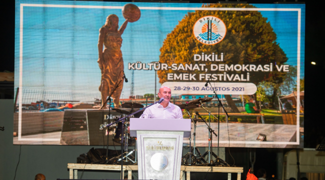 Dikili Belediyesi tarafından 28 – 29 - 30 Ağustos tarihlerinde düzenlenen Dikili Kültür-Sanat, Demokrasi ve Emek Festivali başladı. Alandaki yurttaşlara “Şahanesiniz, çok güzelsiniz, çok özlemişiz” diyerek sözlerine başlayan İzmir Büyükşehir Belediye Başkanı Tunç Soyer, pandemi nedeniyle etkinliklerin iptal olduğu dönemleri hatırlatarak “İhtiyaç duyuyoruz, kültüre sanata. Onlar olmadan hayatımız ne kadar kuru, renksiz, tatsız. Kültür sanat bizi besleyen, umudumuzu büyüten bir şey. Bu festivaller kucaklaşmamız, birbirimize sarılıp sahip çıkmamız, dayanışmamızı güçlendirmemiz için çok büyük bir fırsat. Birbirimizle sarılıp kucaklaşmayı çok özlemişiz. Adil Başkanımı tebrik ediyorum, çok büyük bir organizasyon. Bizim kültür sanat politikamızın 2 temel aksı var. Biri İzmir'i dünyanın kültür birikimiyle buluşturmak. Diğeri de binlerce yıllık mirastan beslenen kültür sanatımızı ileriye taşımak. Bu festival ikisini de birlikte gerçekleştiriyor. Dünyanın o birikimini sizlerle buluşturacak, hem de o kadim kültürü yeni ürünlerini sizlerle buluşturacak. Bizler hayatı değiştirmek için siyaset yapıyoruz. Siyaset eğer hayatı değiştirme sanatıysa, başka bir hayatın ve dünyanın mümkün olduğunu biliyoruz. Onun için siyaset yapıyoruz. Genel Başkanımız Kemal Kılıçdaroğlu ile Muğla'da yangın yerlerini ziyaret ettik. Ziyaret sırasında Genel Başkanımız bir yerde durdu. Yangının en kötü yaşandığı bölgelerden biriydi. Orada yanmış bir ağacın içinden serpilip çıkmış menengiç filizinin fotoğrafını çekti. İçiniz rahat etsin, toplumlar da aynı doğa gibi kendini iyileştirebiliyor, tazeleyip yeniliyor. Bütün bu yangınlardan, çürümüşlükten, kokuşmuşluktan emin olun ki kurtulacağız, hep beraber kurtulacağız” dedi.