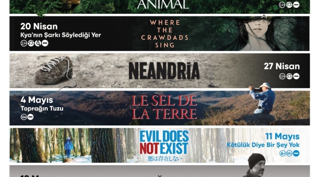 Film gösterimleri kapsamında 13 Nisan’da Hayvan Krallığı, 20 Nisan’da Kya'nın Şarkı Söylediği Yer ve 27 Nisan’da Neandria var. Mayıs ayı gösterimleri ise 4 Mayıs’ta Toprağın Tuzu filmi ile başlayacak. 11 Mayıs’ta Kötülük Diye Bir Şey Yok, 18 Mayıs’ta Buğday ve 25 Mayıs’ta Flow: Bir Kedinin Yolculuğu filmleri sinemaseverlerle buluşacak. Tüm filmler İzmir Sanat Büyük Salon’da saat 19.00’da ücretsiz olarak gösterilecek.