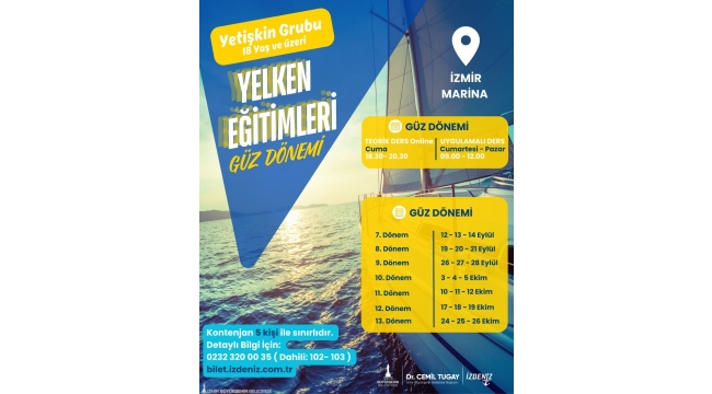 Cuma günleri online teorik, cumartesi ve pazar günleri ise İzmir Marina’da uygulamalı olarak gerçekleştirilecek eğitimlerde kontenjan 5 kişiyle sınırlı. 18 yaş ve üzeri katılımcılara açık olan eğitimlerin ücreti 6.000 TL olarak belirlendi. Kayıtlar bilet.izdeniz.com.tr adresinden yapılabiliyor. Ayrıntılı bilgi almak isteyenler için telefon numarası ise 0232 320 00 35 (Dahili 102–103).